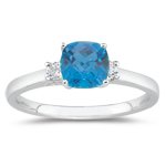 This stunning Classic Three Stone Swiss Blue Topaz and Diamond Ring exhibits an AAA quality cushion-cut Swiss Blue Topaz, embellished with two enthralling Diamonds prong set in eighteenK White Gold. Approximate Gemstone Weight: 1.42 Carats. Approximate Diamon This product is sold by JEWELS BY SABRINA.,SHAPE:Cushion D/C,SHAPE:Round,METAL:18K Gold,RHODIUM:Yes,SETTING STYLE:Prong Setting,SETTING STYLE:Prong Setting,MINIMUM CARAT TOTAL WEIGHT:0.1,MINIMUM CARAT TOTAL WEIGHT:1.42,MINIMUM COLOR:H,MINIMUM CLARITY:VS,GEMSTONE DIMENSIONS:7 mm,GEMSTONE:Swiss Blue Topaz,COLOR:Medium Blue,ACTUAL METAL:18K White Gold,NUMBER OF DIAMONDS:2,AVERAGE COLOR:Medium Blue,AVERAGE QUALITY:AAA,NUMBER OF STONES:1